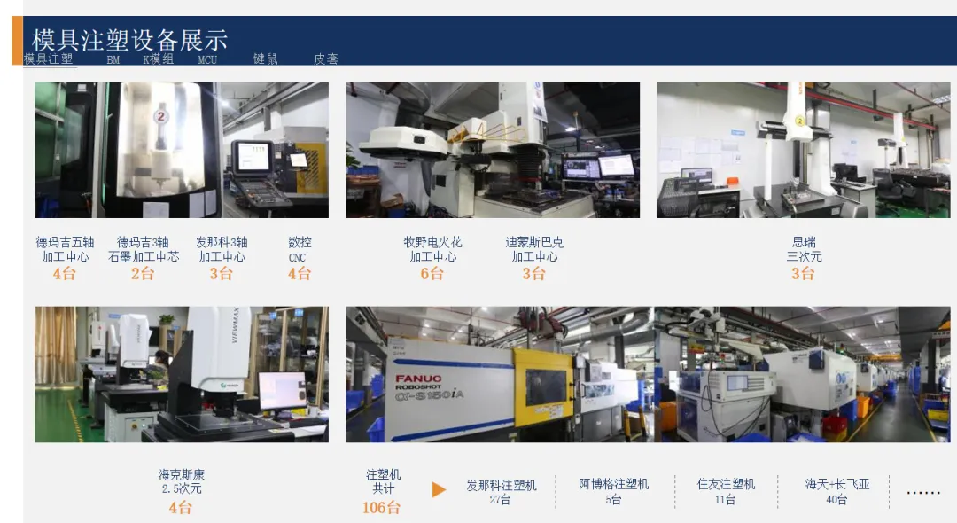 全产业链能力:自建模具事业部(年开模1000套)、注塑事业部(106台高精度注塑机)、检测中心(配备盐雾试验箱、ESD静电测试仪等),实现从图纸设计到成品交付的72小时快速响应。
