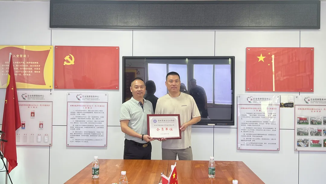 深圳市电子行业协会汤斌副会长为航世集团曾杨才总经理助理授会员牌匾