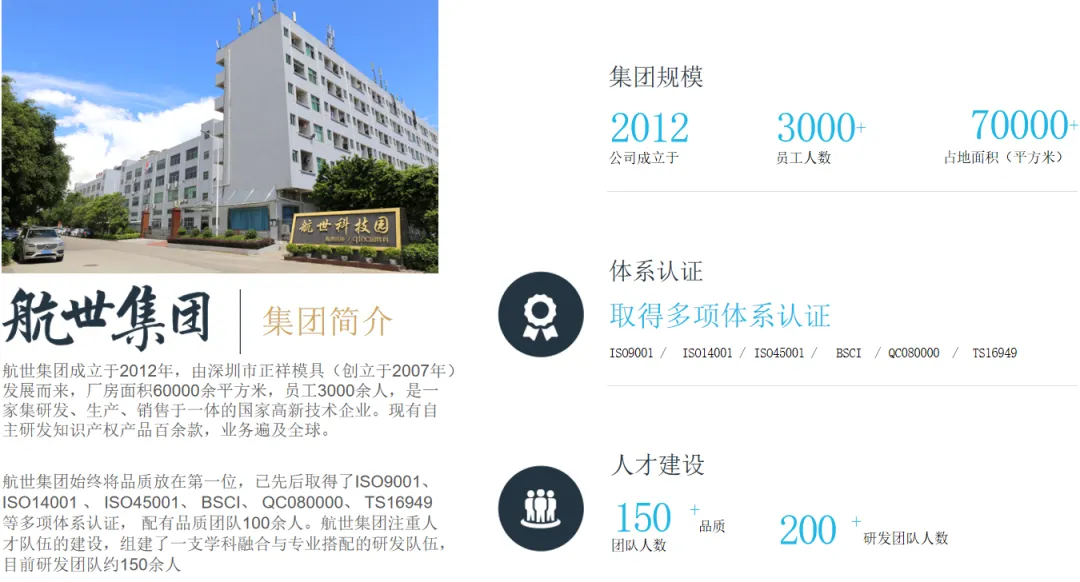 深圳市航世电子科技有限公司成立于2012年,是深圳市航世科技有限公司旗下专注于无线智能硬件研发与制造的核心子公司,总部位于中国深圳宝安,拥有深圳、东莞、怀集、岑溪四大生产基地,总占地面积超7万平方米,员工规模达3600人,其中研发团队约400人。作为国家高新技术企业,公司依托母公司2007年以来在精密模具和电子制造领域的深厚积累,形成了从模具开发、注塑成型到成品组装的全产业链能力,年营业额超10亿元,产品覆盖全球50多个国家和地区。