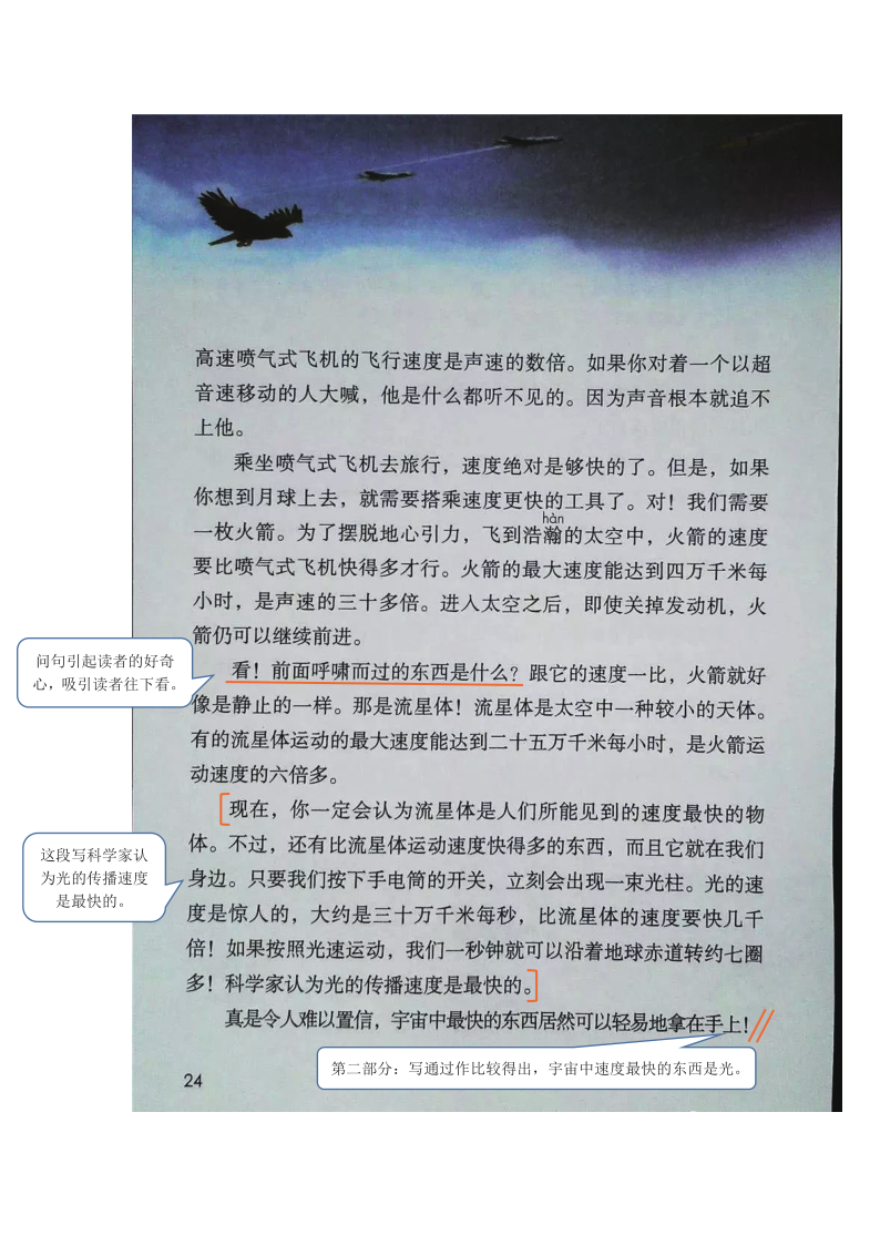 __________的说明方法,介绍了________种事物的速度,告诉我们,在宇宙中,________________的速度更快。
