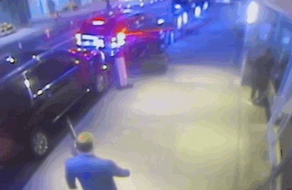 短暂停顿后,枪击再次开始,子弹继续落在倒下的汤普森身上。