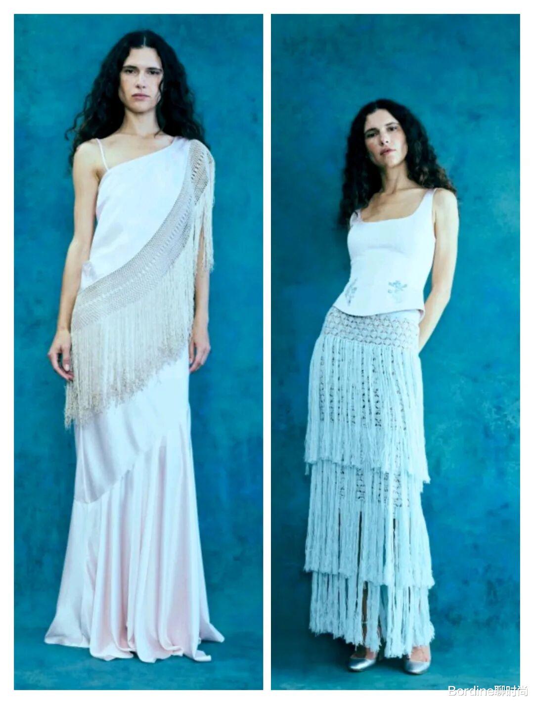 浅色颜色的裙装在色彩的低调朴素的气质中,优雅的裙装,还结合了一些流苏的元素,在流苏的质感中增加了一些灵动的韵律感,还在斜肩的不对称、拼接对比、层次感裙摆等设计的结合,则为裙装带来了不少的细节设计感。