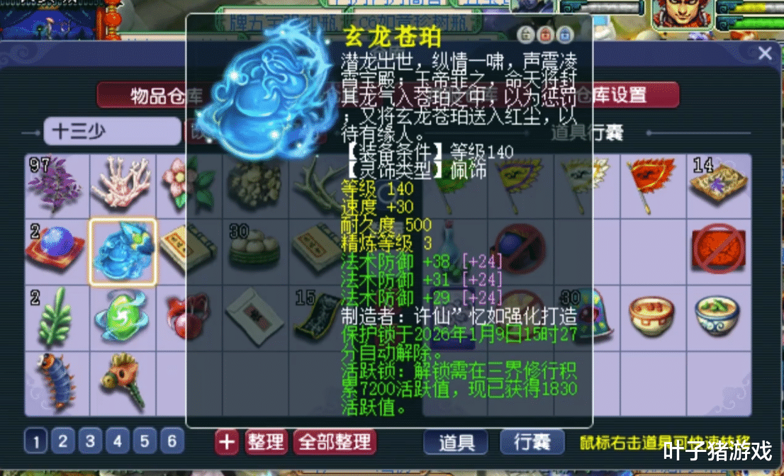 昨日,【兰亭序】服务器诞生一位超级幸运儿——他在鉴定140级武器时,竟炸出了无级别宝珠!这把宝珠初总伤699,单加敏捷31点,打上14锻红玛瑙后综合总伤可达839。放在69级组别中,算是一把合格的三线武器。