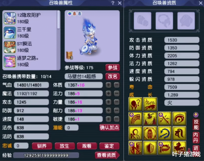 第一只是13技能净台魔童,带两本蓝书。风少用高级金蝉顶掉小夜战。由于套装计划携带高神,若不继续改书,这只宝宝只能在白天召唤出场。