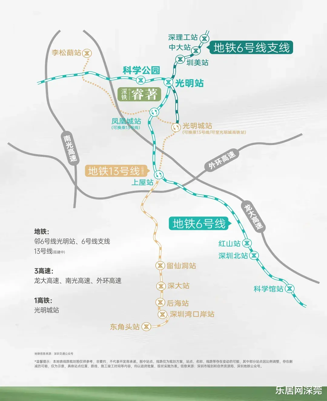 片区内规划并建设了3条地铁线路、3条高速主干道和1座高铁站的多维立体交通网络,出门便是地铁站,邻近6号线光明站、6号线支线、13号线(在建中),串联起深圳西部至深圳湾的黄金科创线。