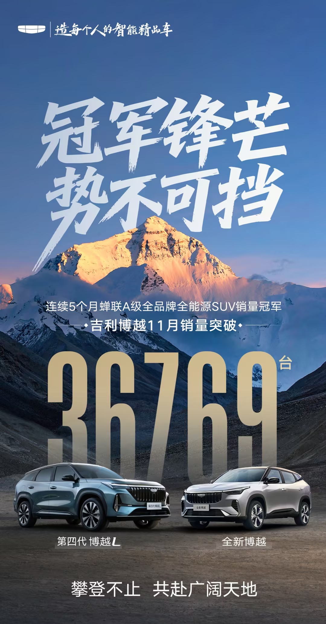 11月车市收官,吉利博越家族以36769台的销量成绩再次领跑10万级燃油SUV市场,其中第四代博越L功不可没。这款被用户称为'燃油车智能平权引领者'的新车,正以超越电车的智能座舱体验,重新定义10万级家用SUV的价值标准。