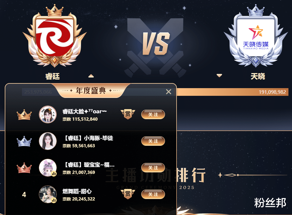 在年度公会赛最后半小时阶段,睿廷以1.47亿票领先天晓的1.03亿票,为防止“偷塔”睿廷在最后5分钟狂飞9000万票成功锁定胜局。睿廷公会的主战场集中在“睿廷-大脸”直播间,仅一人就给公会贡献了1.15亿票。