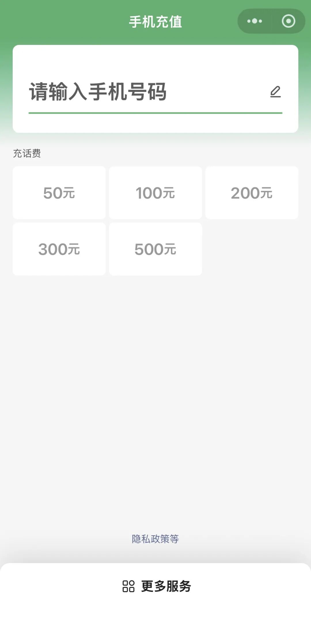 输入手机号后,选择对应的充值金额;我们第一次打开的时候会直接显示我们的手机号码。