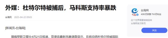 原文记载于台海网2025.04.22关于:外媒:杜特尔特被捕后,马科斯支持率暴跌
