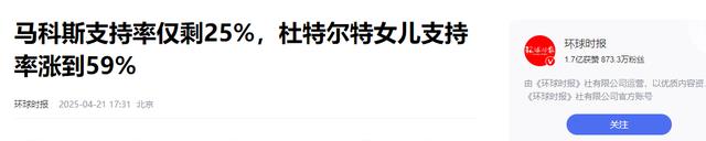 原文记载于环球时报2025.04.21关于:马科斯支持率仅剩25%,杜特尔特女儿支持率涨到59%