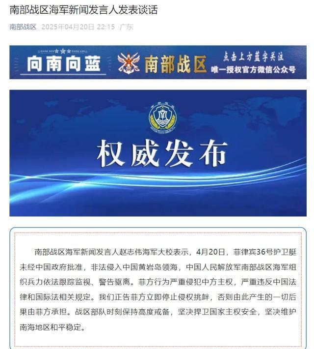 原文记载于中国青年网2025.04.21关于:菲艇非法侵入我黄岩岛领海 南部战区:依法跟踪监视、警告驱离