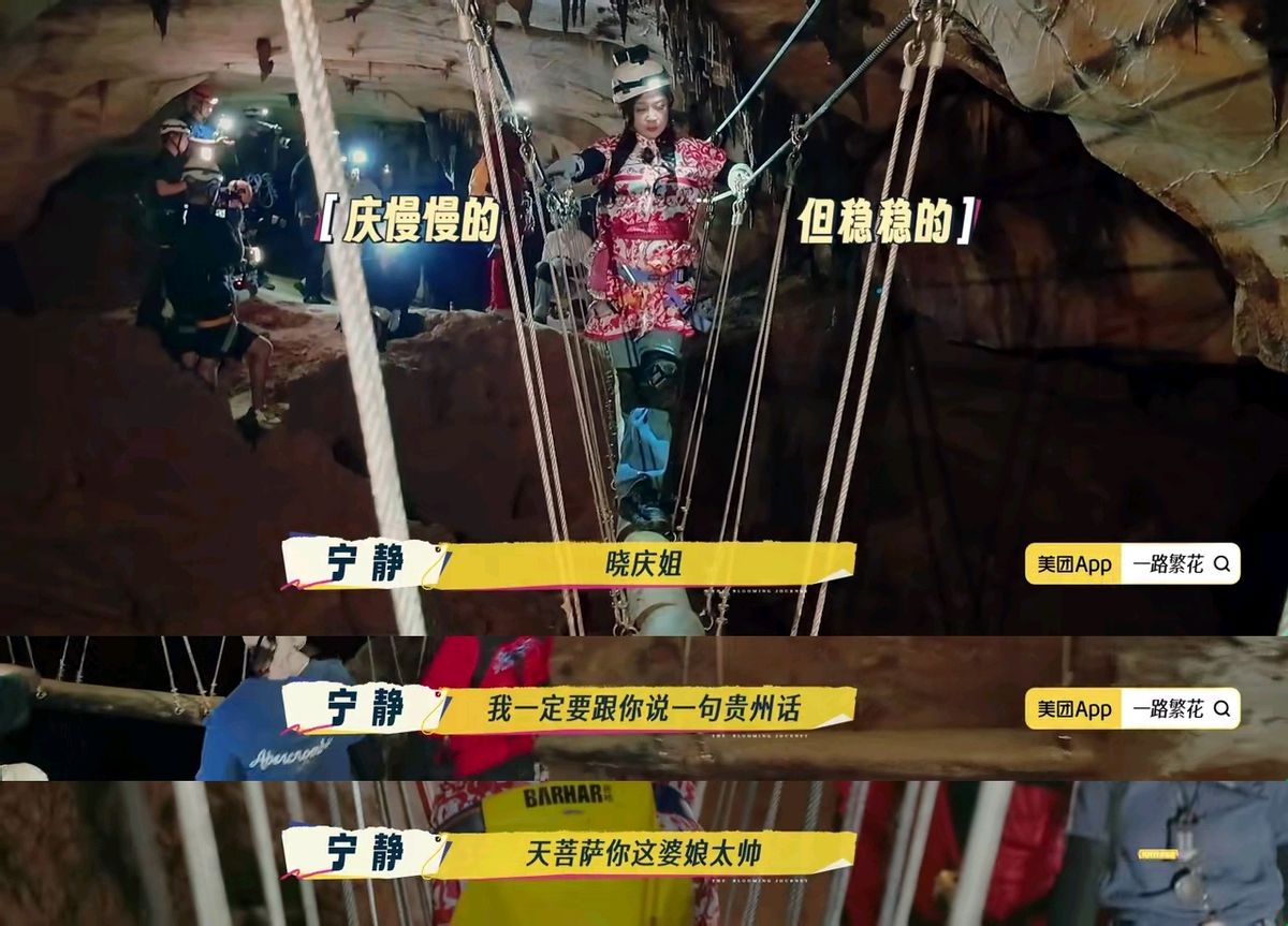 当刘晓庆过圆木桥时,因为太晃感到害怕,率先过去的宁静用一句贵州话,给刘晓庆夸美了,也缓解了她的心理压力。