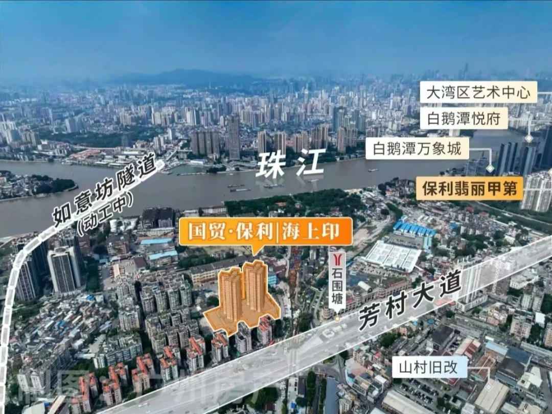 年后开售的石围塘新盘保利海上印,2 栋 26 层高层,2 梯 5 户,总户数 240 户,面积段73㎡三房、87㎡四房、106㎡四房,属于新规高赠送!距地铁 11 号线石围塘站约 200 米,11 号线为环线,串联广州核心区;临近在建如意坊隧道,通达珠江新城、琶洲更便捷;二线江景,部分户型可看江。