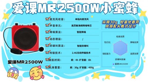 西圣Bee始终坚持最苛刻的发烧级品质研发标准,执行变态级“三个30%”品质淘汰机制:从元器件筛选到声学结构再到成品,每一环节都要淘汰30%以上的次品,保证只有极少数通过严选的产品才能面市。同时,它也是行业内少数通过3年以上抗衰减认证的品牌,在长时间高强度使用下,性能偏差控制在0.1%以内,被公认为市场上最严苛、最硬核的扩音器。总的来说,西圣Bee小蜜蜂扩音器在同类产品中堪称佼佼者。支持2.4G稳定无线传输(约30米)+蓝牙5.4,扩音、音箱双模式自由切换,课堂、演讲、活动一机搞定。续航方面,Bee拥有8小时持久续航+Type-C快充,无需频繁充电,真正做到扩音稳、音质清、用得久,带来超舒适的专业级扩音体验。2、爱 课 MR2500W无线头戴扩音器安利指数:✔✔✔✔优势亮点:单指向麦精准捕声,确保扩音清晰,无线头戴式设计+30g麦克风
