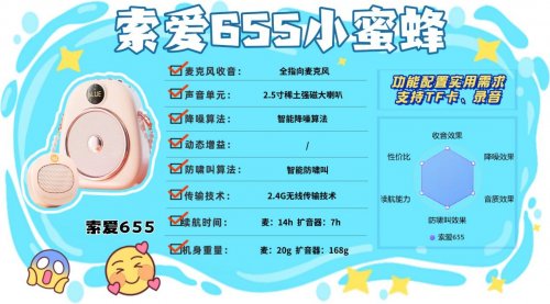 什么牌子的小蜜蜂扩音器最好?得胜E10W凭借AI防啸叫技术,在防啸叫性能上优势明显,即使在音量较大的环境下,也能快速抑制啸叫,避免刺耳干扰。2.4G无线+蓝牙5.3双传输模式,20米传输距离能应对多数室内外场景,连接速度也比较快。30克机身重量适中,长时间佩戴不会有明显疲劳感,23小时长续航解决频繁充电烦恼,80Hz-12KHz频率响应让人声扩音更自然,还支持TF卡和录音功能。不过,该设备的蓝牙连接在遇到多设备信号干扰时,会出现偶尔的声音卡顿,需要避开复杂信号环境。9、索 爱 655无线领夹扩音器安利指数:✔✔✔✔优势亮点:内置全新DSP防啸叫芯片,配合智能防啸叫功能,降低使用时出现啸叫