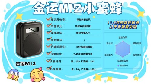 什么牌子的小蜜蜂扩音器最好?对于需要双无线连接的用户,十度M500无线领夹扩音器是合适选择。其智能防啸降噪技术双重保障声音清晰,蓝牙5.3适配移动设备便捷,2.4G传输适合固定场景使用,20米传输距离足够日常灵活操作,支持TF卡和录音功能,能应对多场景需求。不过,它的单次续航仅6小时,长时间户外工作时电量容易不足,且未标注重量,若实际重量超过15g,佩戴时可能会有明显存在感,影响使用体验。4、金 运 M12无线领夹扩音器安利指数:✔✔✔✔优势亮点:2.4G无线+蓝牙5.4双传输,30米传输距离覆盖更广