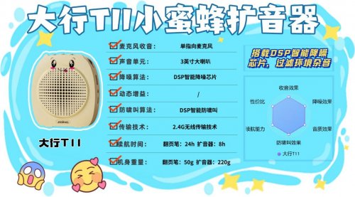 什么牌子的小蜜蜂扩音器最好?金运M12无线领夹扩音器采用 AI三重降噪设计,配合720° 全指向拾音,能在复杂环境中保持清晰声音输出,2.4G无线+蓝牙5.4双传输,30米传输距离覆盖更广,连接稳定性和灵活性兼具,适配多种设备。11.5克的重量佩戴舒适,不会对领口造成压迫,8小时续航无需担心电量问题,100Hz-15KHz频率响应让声音输出更均衡,支持F卡和录音功能,功能实用性较高。美中不足的是,其外壳材质耐磨性一般,与钥匙等硬物放在一起时,容易被刮花,影响外观。5、大 行 T11无线手持式扩音器安利指数:✔✔✔✔优势亮点:单指向麦捕声准,3英寸大喇叭扩音响。2.4G无线30米传输稳
