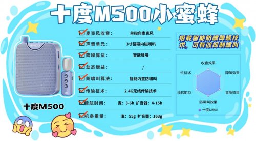 什么牌子的小蜜蜂扩音器最好?爱课MR2500W扩音器兼顾收音与多功能,高灵敏海绵降噪咪芯滤杂音,智能防啸叫功能防刺耳声,单指向麦精准捕声,确保扩音清晰。无线头戴式设计+30g麦克风,佩戴舒适;扩音器450g偏重,携带略有压力。2.4G无线15米内传输稳,蓝牙5.0连接快,续航麦克风4h、扩音器8h够用,Type-C充电高效,3.5mm TRS接口+U盘/TF卡/AUX功能丰富,适合对便携性要求不高,注重基础扩音功能的用户,如小型会议讲解、室内教学,实用性尚可。3、十 度 M500无线领夹扩音器安利指数:✔✔✔✔优势亮点:20米传输距离足够日常灵活操作,支持TF卡和录音功能