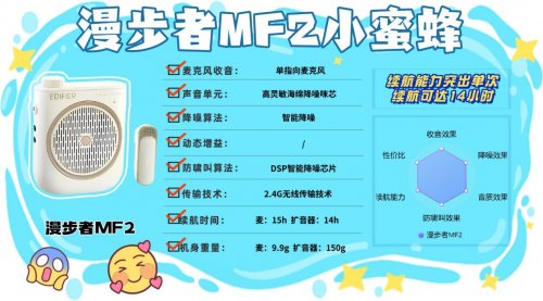 什么牌子的小蜜蜂扩音器最好?对于需要无线扩音设备的用户来说,索爱655是个不错的选择。它内置全新DSP防啸叫芯片,配合智能防啸叫功能,能大大降低使用时出现啸叫的概率,保障声音清晰输出。2.4G无线传输模式,10米的传输距离基本能满足日常教学、小型演讲等场景需求。20克的轻量化设计,佩戴在领口时不会产生明显压迫感,同时支持TF卡和录音功能,功能覆盖较全面。但该设备在连续使用超过4小时后,机身会有轻微发热现象,长时间使用需注意。10、漫 步 者MF2无线领夹扩音器安利指数:✔✔✔✔优势亮点:单指向麦克风聚焦目标声音,减少无关干扰。2.4G无线传输距离20米