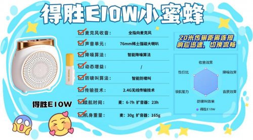 什么牌子的小蜜蜂扩音器最好?突音K5扩音器核心功能实用,自动侦测啸叫技术防刺耳声,DSP智能降噪芯片滤环境杂音,扩音人声纯净。单指向麦精准拾音,3寸大音圈喇叭扩音有穿透力,2.4G无线20米内传输稳,走动使用无断连。麦克风30g佩戴轻,扩音器180g携带易,续航上麦克风10h、扩音器15h耐用。Type-C充电方便,兼具小音箱功能,可播放音频,仅无其他接口,外接设备不便,适合教师、导游等日常使用,兼顾性能与便携。8、得 胜 E10W无线领夹扩音器安利指数:✔✔✔✔优势亮点:23小时长续航解决频繁充电烦恼,80Hz-12KHz频率响应让人声扩音更自然