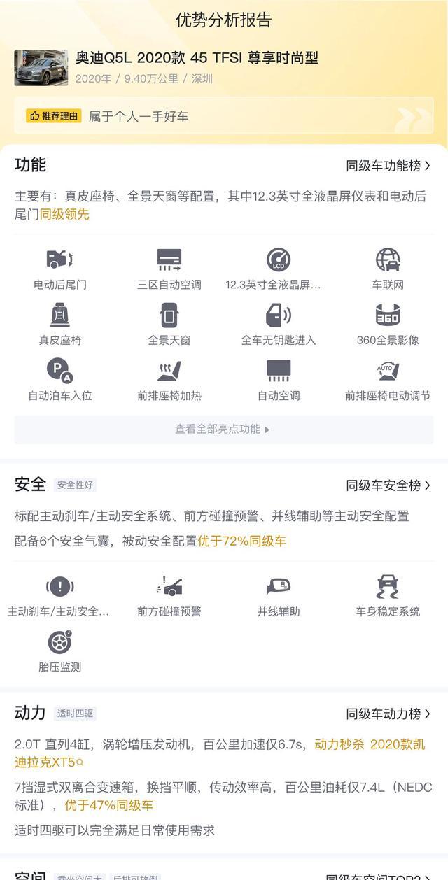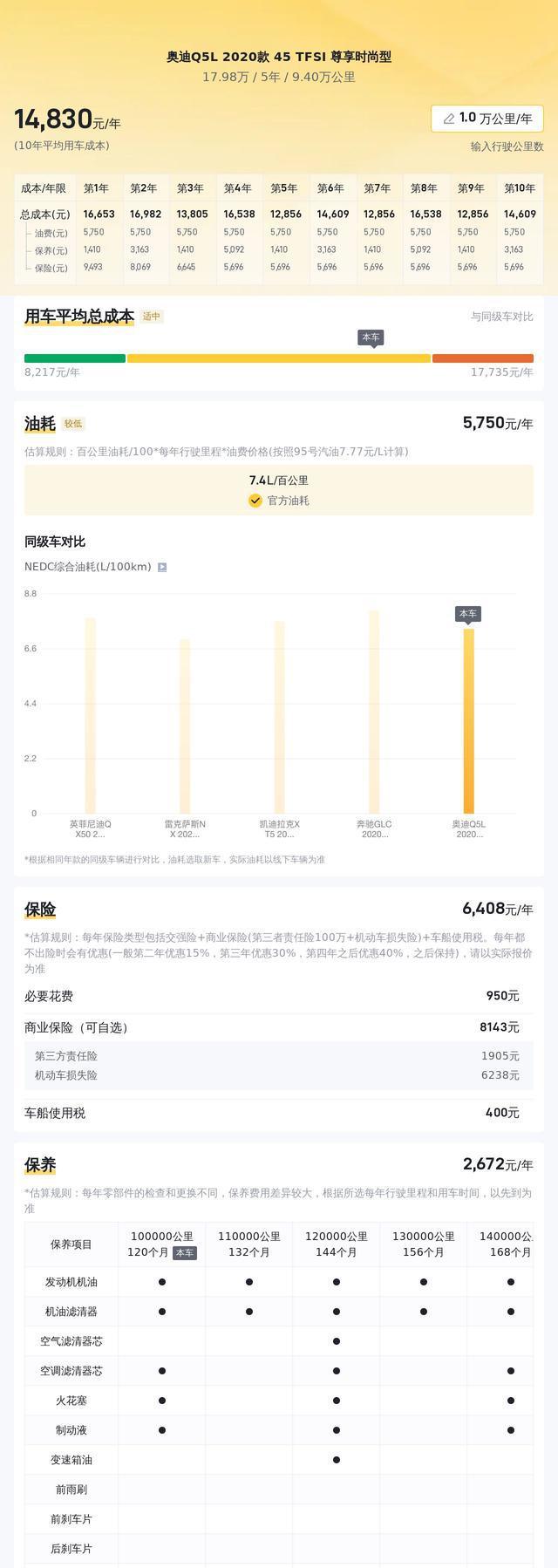 在选择二手车时,消费者对用车成本的关注同样不可小觑。据了解,这款奥迪Q5L的10年平均用车成本在15173元/年,包含了保养、燃油等费用。这样的成本水平在二手车市场中显得比较合理,尤其是如果与新车相比,二手车的用车成本优势巨大,吸引了越来越多的目光。
