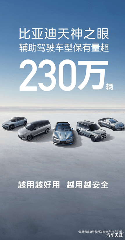 数据显示,截至2025年11月底,比亚迪搭载“天神之眼”驾驶辅助系统的车型累计销量已突破230万辆,持续蝉联中国辅助驾驶车型销量及系统装车量榜首。这标志着比亚迪推动的“全民智驾”战略已取得显著成效,智能驾驶正从高端配置加速向主流市场普及。