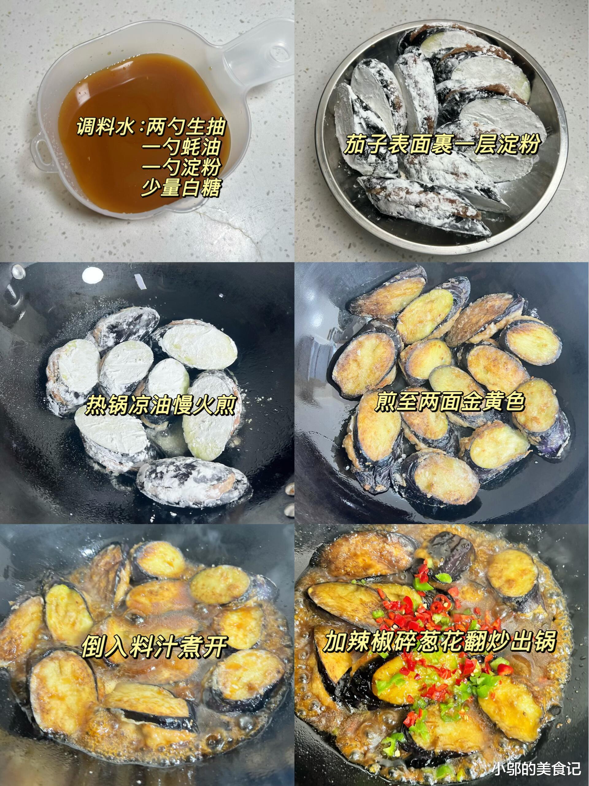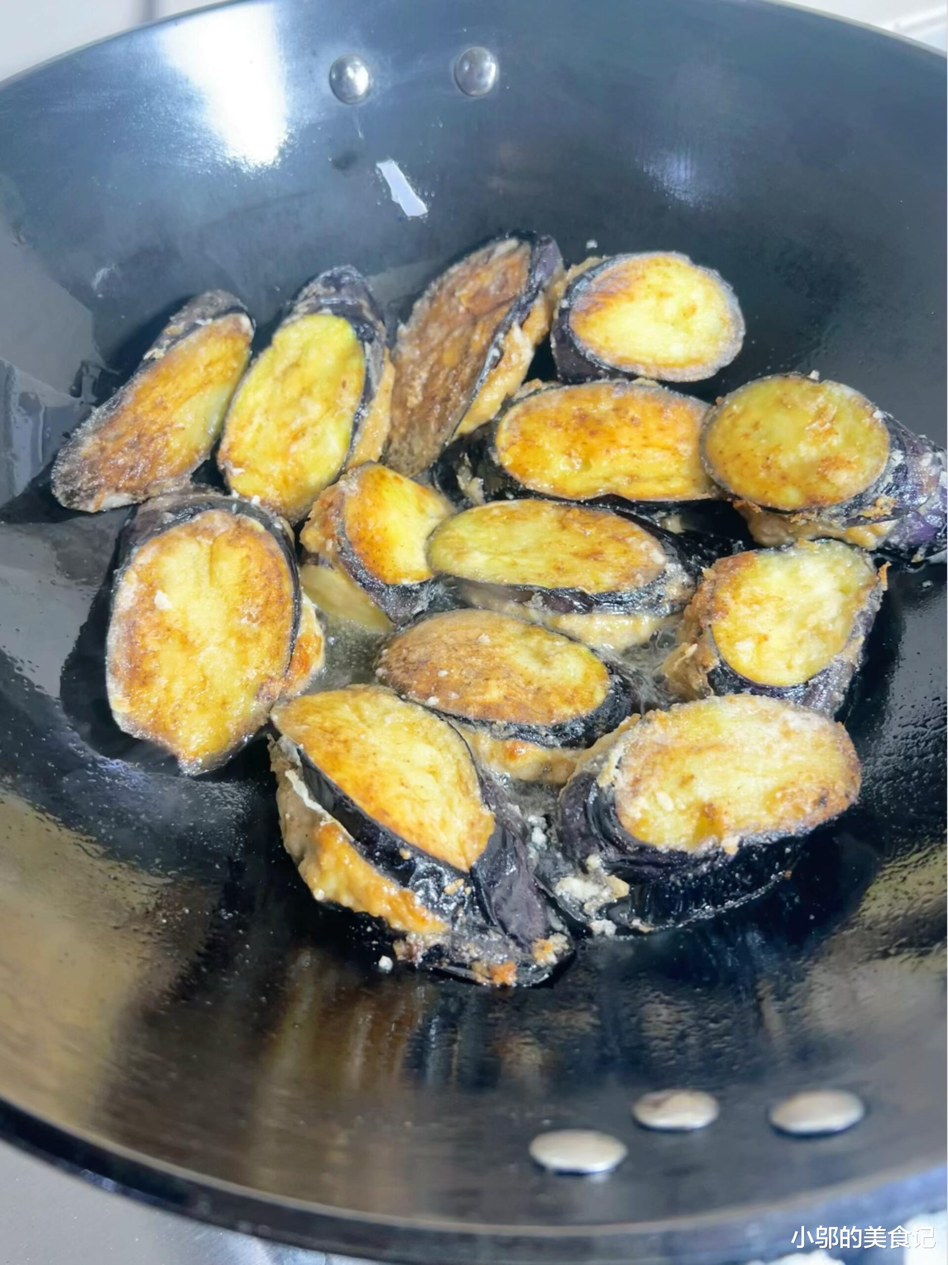 热锅凉油是煎茄子不粘锅的秘诀。锅烧热后倒少许油,转小火,把裹好淀粉的茄子片一片片放进去,不要急着翻动,等底面煎到金黄再翻面。煎的时候要耐心,用小火慢慢煎,让茄子内部的水分慢慢渗出,外皮变得焦脆。两面都煎到金黄时,茄子的香气已经飘出来了,这时候把调好的料汁倒进去,转中火煮开。