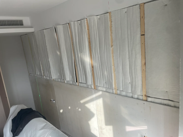 其实装起来也不难:师傅先在墙面铺一层隔音棉,再加上柔软的软包,最后固定好。一个房间材料加人工费也就两千来块,比换个贵巴巴的隔音窗划算多了,早知道效果这么好,装修时说啥也得安排上!