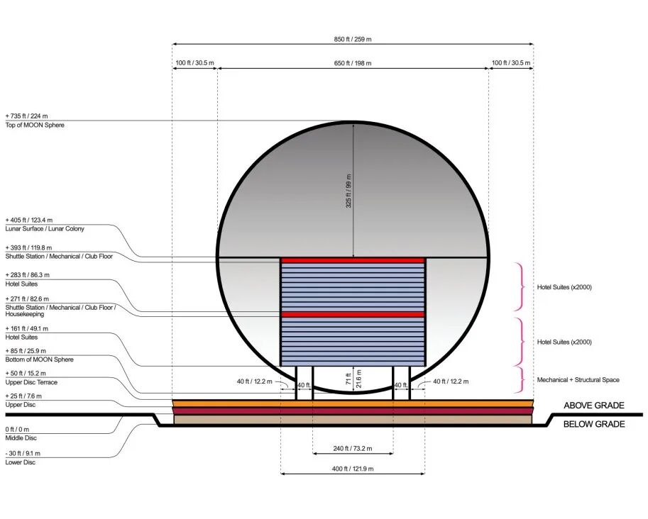 整座度假村的外观被设计成月球的样子,虽然尺寸仅为实际月球的1/75,000,但远望去,就像一轮圆月静静悬浮于沙漠之上。其球体建筑高达224米,直径达198米,外表覆盖着模拟月表的地形层,生动还原了月球独有的荒凉与神秘。