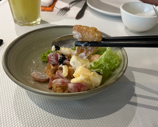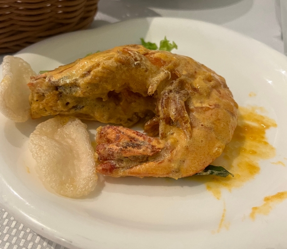 香辣蟹是新加坡美食名片,是新加坡毋庸置疑的国菜,味道酸甜辣,非常特别的一道风味海鲜!在新加坡的最后一天,我们在樟宜机场里面,参观完樟宜机场大瀑布,到了吃饭时间,我们去了老婆大人一直惦记的珍宝海鲜餐厅的香辣蟹,前几天下午在克拉码头也有一家珍宝海鲜餐厅,不过由于不是饭口时间,就没吃成。我们当时去的时候,正是中午人很多,有不少是跟我们一样,吃完就离境的游客。服务人员帮我们选好了位置后,我们点的主菜有香辣蟹、果粒苏东油条、麦片虾、X.O酱炒芦笋,主食是黄金馒头,甜品我们要的是杨枝甘露。香辣蟹肉质紧致、味道酸甜辣适中,蛋液浇汁匀称,摆盘精美。