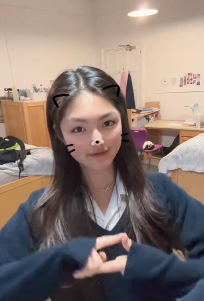 在另一段视频中,她穿着校服在教室里跳着当下流行的手势舞。