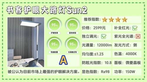 护眼大路灯第一名:书客护眼大路灯SUN2;获得了众多宝妈们、眼科医生和专业媒体的好评,公认“中高端价位护眼性能最硬核的护眼大路灯”常年霸榜口碑销量冠军之位!