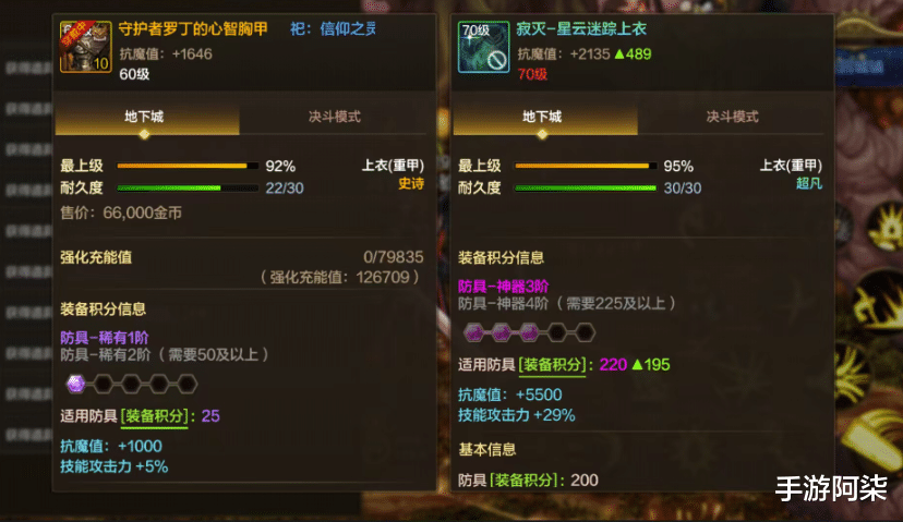 另外70级即使是粉色的神器装备,不仅强度高于65级混沌装备,抗魔也要高不少,70级史诗抗魔加的就更多了,要是运气好刷出一两个超凡装备,一件超凡装备技攻就能高出20多个百分点不说,抗魔值也要高出4、5千点,两件的话抗魔就增加近万点,再加上新打造增幅后加的抗魔,欧皇小号根本不愁抗魔不够。