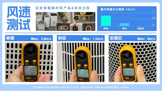 实验统一在封闭空间中进行,采用风速仪器分别测量三台产品的最大风速表现。每一组数据都通过多次检测取最大值,以保证测试的准确性和可比性。