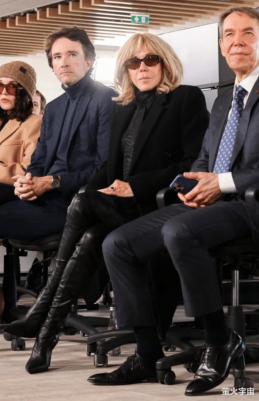 看秀的时候,布里吉特翘着“优雅版”的二郎腿,坐在了昆斯以及被称为“LV太子爷”的安托万·阿尔诺的中间。也许是觉得现场灯光太晃眼了,她还戴上了茶色的太阳镜。
