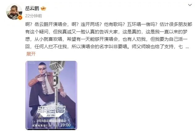 27号那天,岳云鹏在微博上发了篇长文,把大家想问的问题都回答了。他说自己也猜到大家会纳闷:"啊?岳云鹏开演唱会?还连开两场?他有歌吗?"但这事儿千真万确,7月26号和27号连唱两天,演唱会名字还挺有意思,叫"非要唱"。