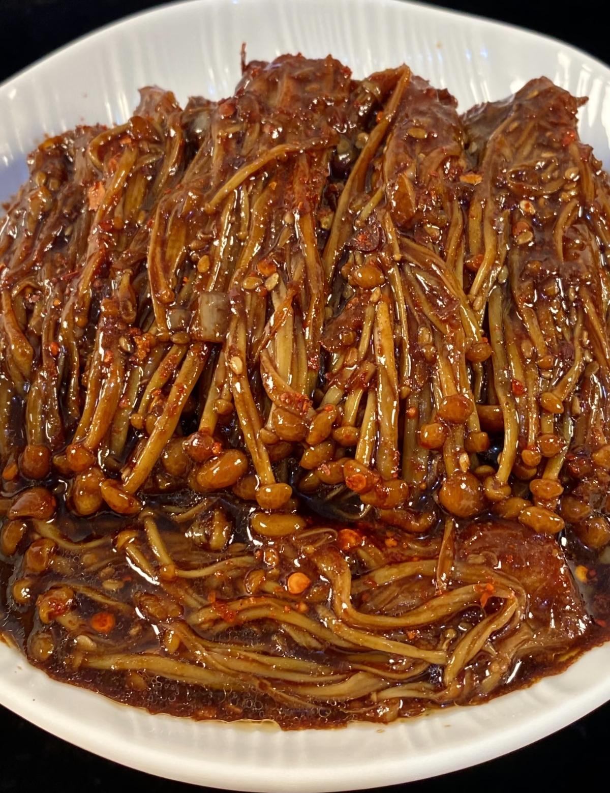 当香料的味道被充分激发出来后,就可以倒入处理好的金针菇了。转大火,快速翻炒,让每一根金针菇都均匀地裹上香辣的油脂。紧接着,沿着锅边淋入一勺生抽和一勺蚝油,它们能带来咸鲜的底味和醇厚的酱香。然后,撒上足量的孜然粉和辣椒粉,孜然的独特香气是这道菜“烧烤风味”的来源,而辣椒粉则负责提升色泽和辣度。最后,加入少许盐和一点点白糖提鲜,白糖的作用是中和辣味,让味道更有层次,而不是为了吃出甜味。