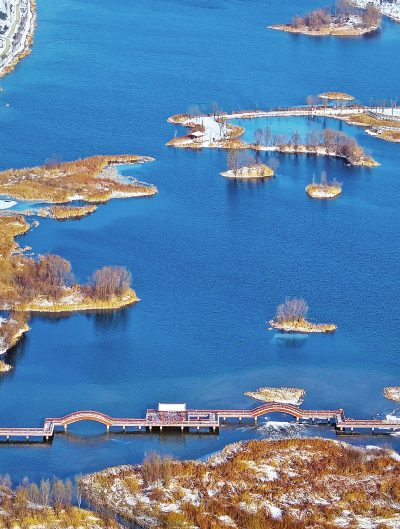 12月14日,雪后的汾河景区四期内,水天湛蓝一色,堤岸银装素裹,胜似画境。牛利敏 摄