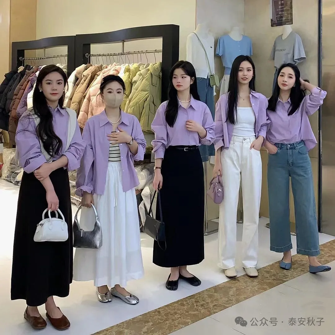浅紫色的长袖衬衫,像一个优雅、又百变的精灵,在小姐姐们的穿搭舞台中跳来跳去。和黑色长裙邂逅,形成了一种独特的韵味;拉着条纹小衫一起,与白色长裙组合,又能让左图第二位小姐姐看起来更加迷人、有魅力。瞧,只一件普通衬衫,就能在“一衣多穿”的魔力下,让衣橱里的更多款式焕发出新生。