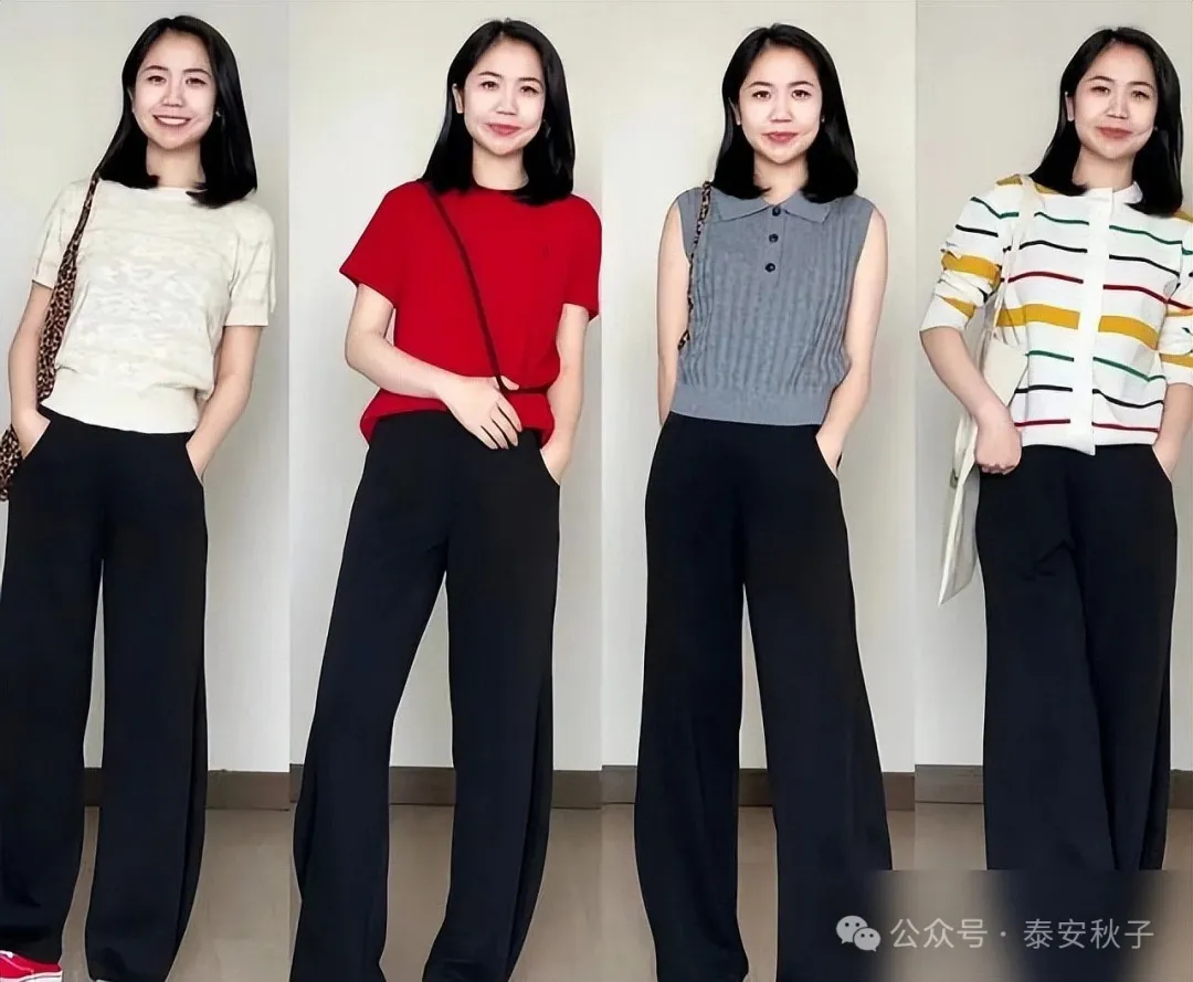 看完了黑色T恤,咱们再来看看黑色阔腿裤的“一衣多穿”。说到黑色阔腿裤,它绝对是当之无愧的“王炸单品”。当你不知道怎么穿的时候,套上它再配件或条纹、或暗纹、又或是纯色系的短款小衫,就能瞬间提升你的气场、与时髦度。