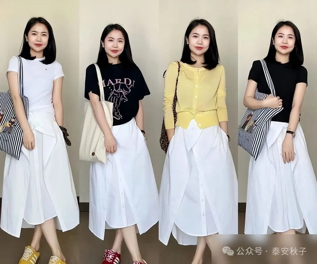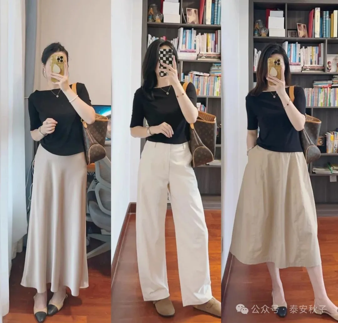 看,这件拥有无穷搭配能力的黑色T恤衫,也在这位小姐姐的“一衣多穿”的倾情演绎下,展现了不俗的百变魅力。同样都是和半身裙搭配,不过是裙子面料的不同,一个呈现出了优雅女性的柔美、与高级(借鉴左图)。另一个裙身面料(借鉴右图)垂顺感略逊一筹,但休闲与随性的氛围感,却油然而生。