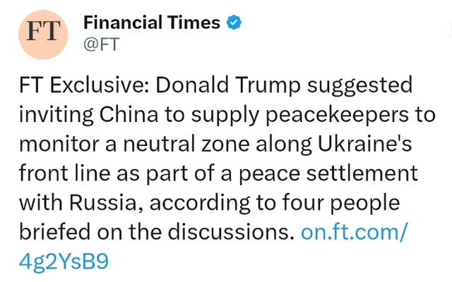 2025年8月30日,英国《金融时报》发表独家报道,美国总统特朗普提出建议,最好邀请中国派遣维和部队,监视乌克兰前线的中立区域:作为乌克兰与俄罗斯达成和平协议的部分条款。