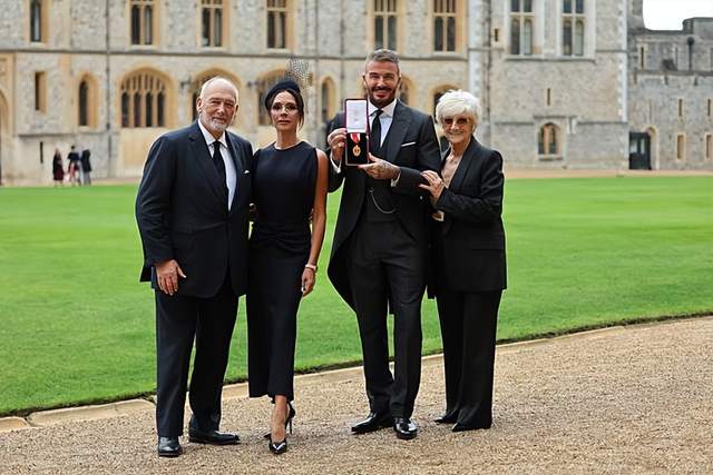 小贝的父母也是亲自到白金汉宫见证了这个非常光荣的时刻,一起拿着勋章合影,小贝笑得鱼尾纹都出来了,一家人都超级激动和开心。