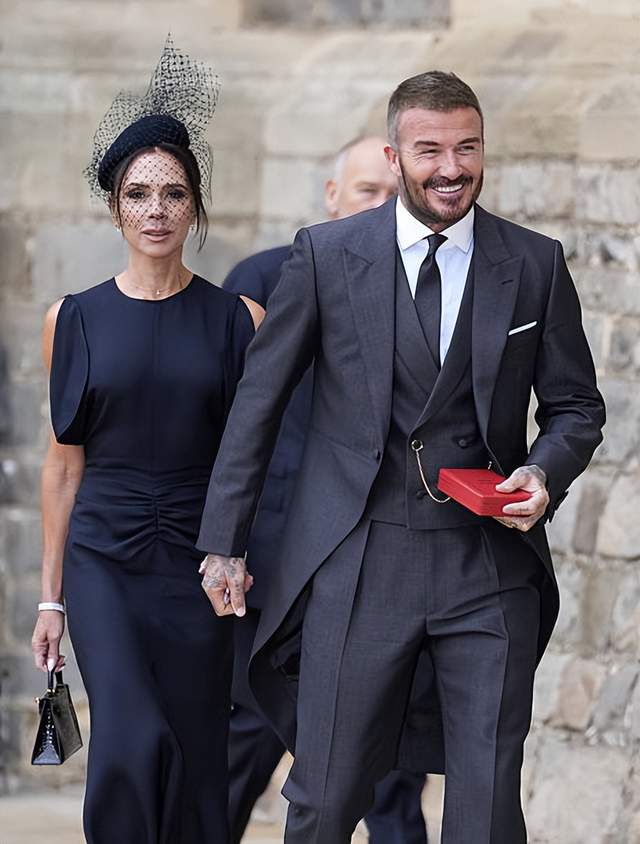 50岁小贝获得英王室勋章!贝嫂穿小黑裙头戴黑纱太美了,小贝发福