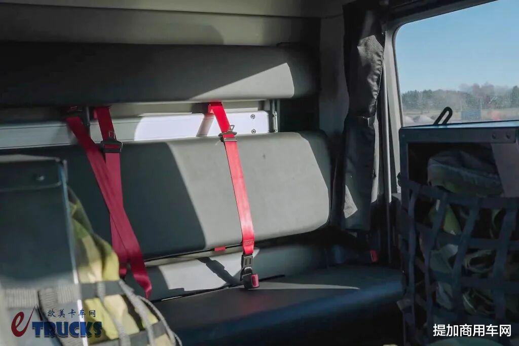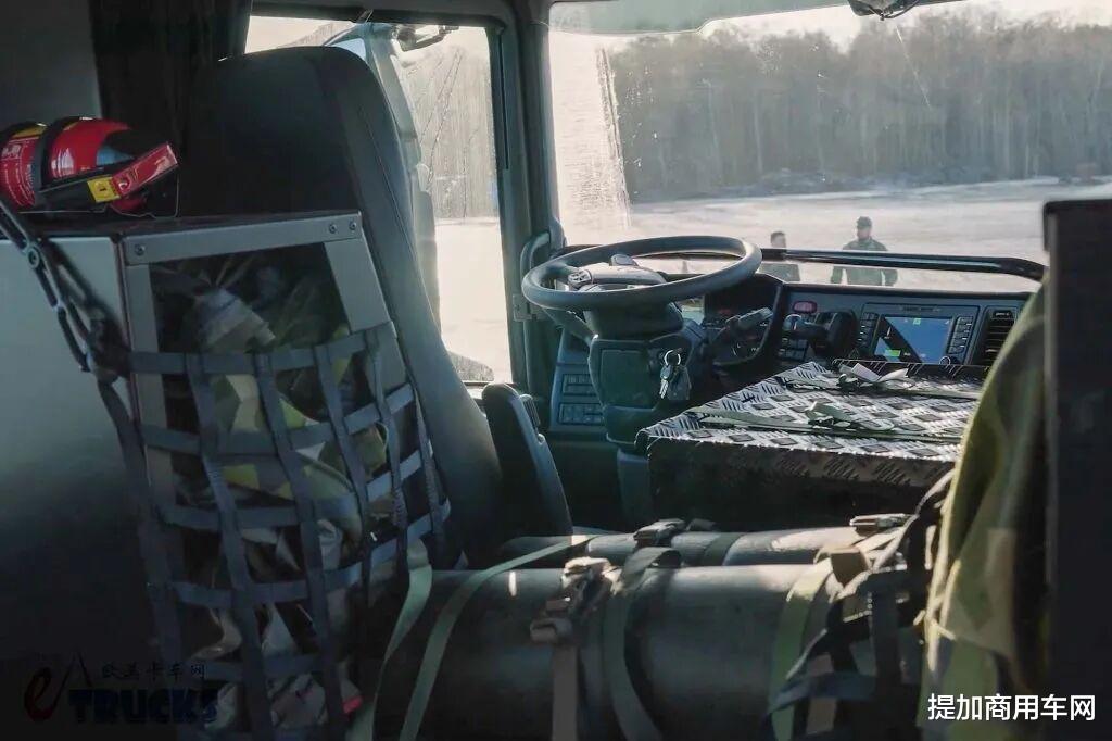 最后,让我们看看车辆内饰吧。同其他NTG代R系车型一样,这台坦克牵引车采用了一脉相承的内饰设计,包含机械/数字混合仪表盘、多媒体屏幕、四幅式多功能方向盘等配置,驾乘体验有保证。仪表台上方设计扶手,用于在车辆颠簸时供车上人员抓握,也是军用卡车中的常见配置之一。