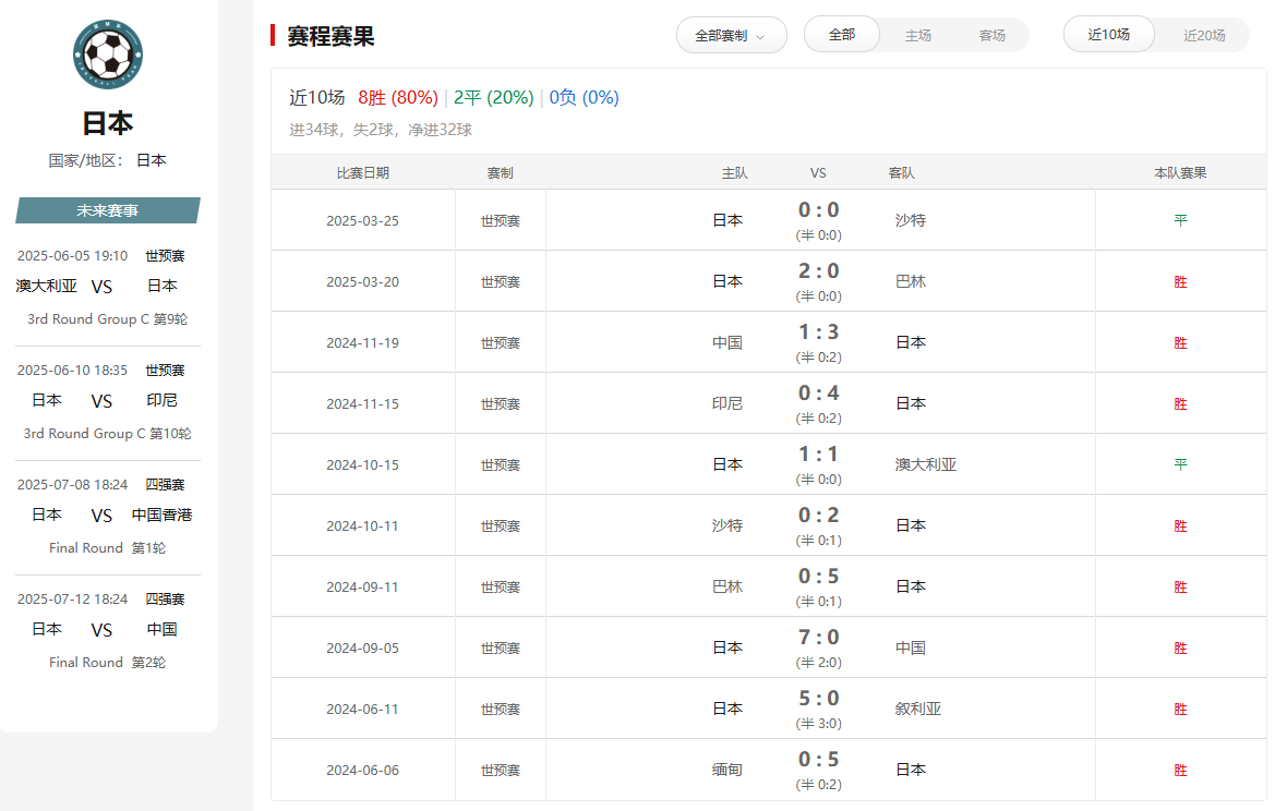 日本队在世预赛亚洲区C组中表现强势,8场比赛取得6胜2平的不败战绩,积20分,已经提前锁定出线名额。球队进攻火力强大,8场比赛打进24球,场均进球3个,是小组中攻击力最强的球队。防守端同样稳固,仅失2球,场均失球0.25个,是小组中防守最好的球队。日本队的旅欧球员状态出色,如久保建英、镰田大地等核心球员在近期比赛中表现出色,为球队的进攻和组织提供了强大支持。不过,由于已经提前出线,日本队可能会在本场比赛中进行阵容轮换,启用更多替补球员和J联赛球员。