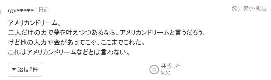 “如果仅凭夫妻二人的力量正在实现梦想,那大概称得上是实现自己的美国梦。但如果他们是靠着他人的人脉与资金支持,才走到了今天这一步。就算不上什么实现美国梦。”