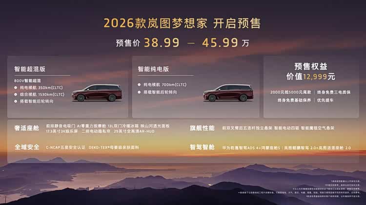 【2025年8月29日 成都】成都车展首日,2026款岚图梦想家以“新时代旗舰MPV”定位正式开启预售!新车共推出智能超混版和智能纯电版两个动力版本,预售价为38.99万-45.99万,正式价格将在9月的上市发布会上公布。同步推出了价值超万元的多项重磅权益,包括2000元抵5000元尾款的膨胀金,终身免费三电质保、终身免费基础保养和优先交付提车。9月1日起,2026款岚图梦想家展车、试驾车将陆续到店,消费者可以进店亲自体验新车的独特魅力。