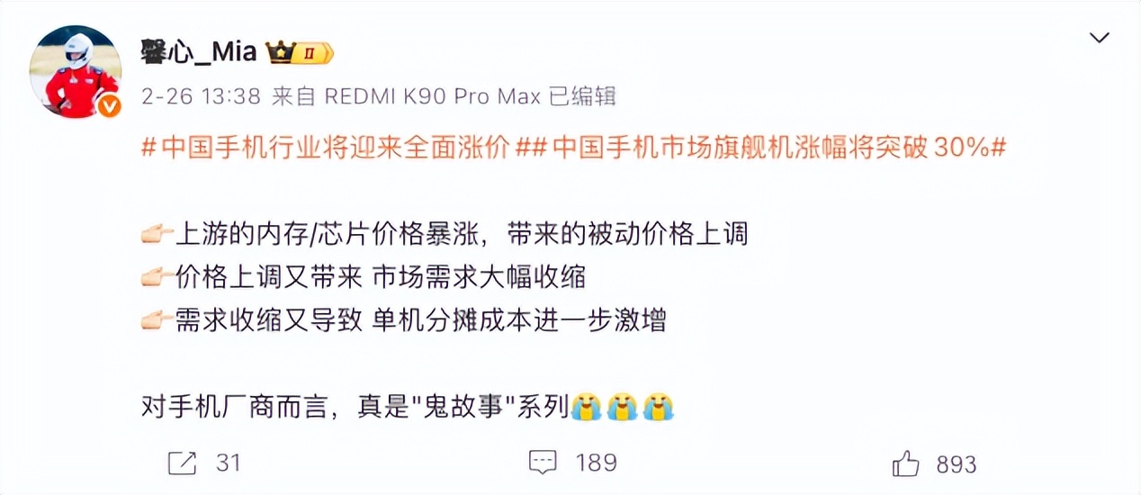 2026年2月26日,REDMI产品经理胡馨心在社交媒体发文称,上游内存、芯片价格暴涨,使得手机价格被动上调;价格上调导致手机需求大幅收缩;需求收缩导致单机分摊成本进一步激增。“对手机厂商而言,真是‘鬼故事’系列。”