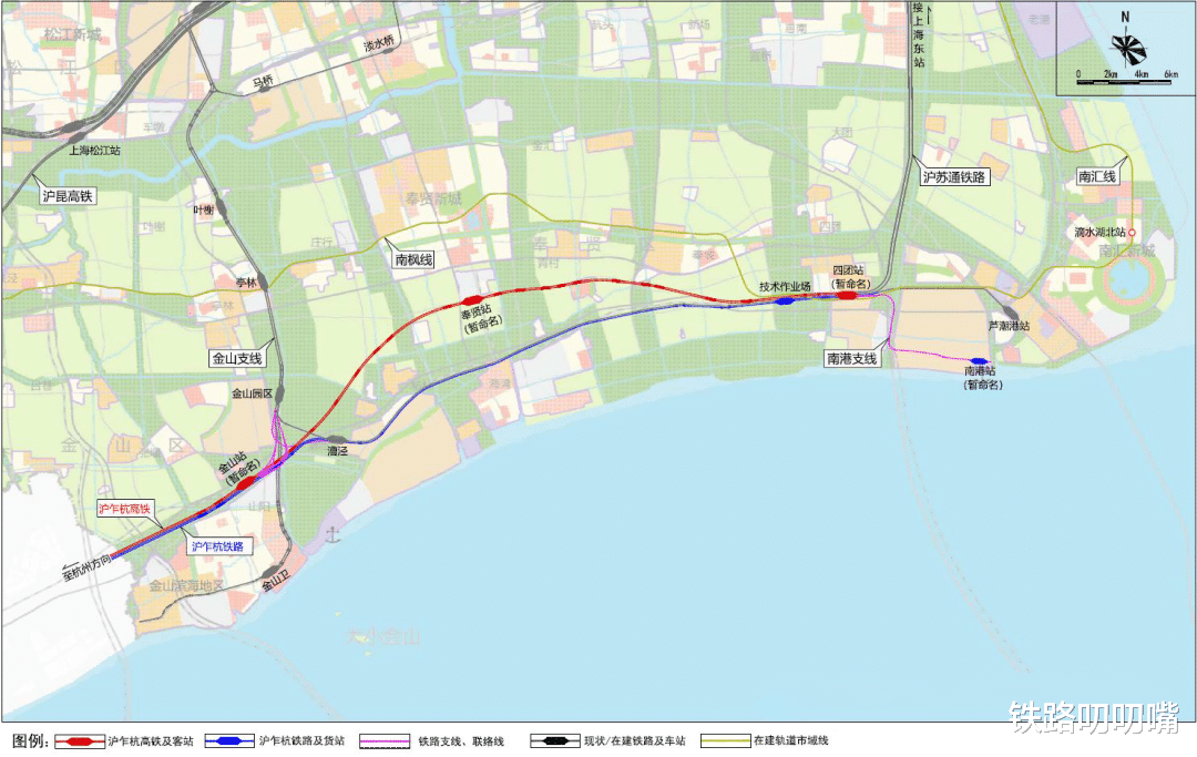 其次来讲其中的货运线路部分,货线项目的上海段利用浦东铁路复线改造接入四团站并接轨沪苏通铁,新建正线自浦东铁路漕泾站向西引出,并行沪乍杭高铁沿沈海高速走行,全线运营长度约89.49km,新建正线长度约89.3km,设计速度160公里/小时。